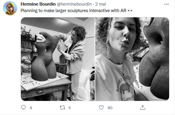 -Les hybrides ou phygital, à mi-chemin entre une production physique et numérique, ce courant crée une relation voire une filiation entre les deux créations, Hermine Bourdin et Léo Caillard sont des sculpteurs de haut niveau qui utilisent leurs talents des deux deux côtés de l'écran.